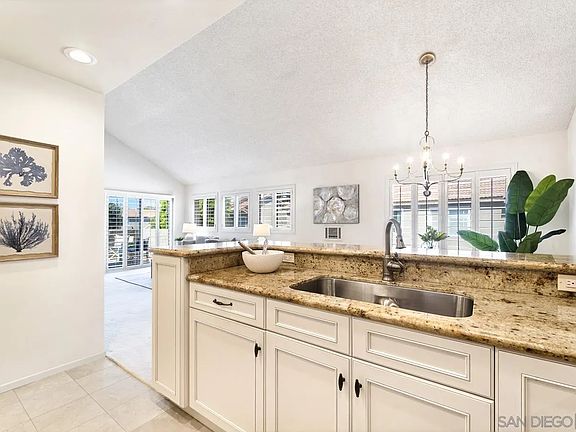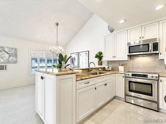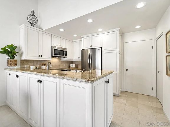 Coastal Living in Solana Beach! This sunny top-floor end-unit exemplifies pride of ownership with extensively remodeled custom kitchen and bath plus private one-car garage and expansive additional storage area. Boasting a secluded location within the community, enjoy delightful coastal breezes and tree-top views from the oversized private entry and elevated balcony area. Inside, you'll find no detail overlooked and meticulous craftsmanship throughout. The kitchen features maple designer cabinets with soft-close hardware, pull-out shelving, hand-selected granite countertops and pristine marble flooring. The bathroom is equally luxurious with marble countertops, marble tile flooring and marble tile shower surround. Additional upgrades include a newer electrical panel and newer appliances including refrigerator, water heater, plus newer garage door and opener. Enjoy the additional convenience of a dedicated, in-unit full-size stackable washer/dryer with ample shelving. Custom shutters throughout enhance privacy and a sliding door from the large living area offers direct access to the light and bright patio with freshly painted deck all highlighting the home’s immaculate condition.