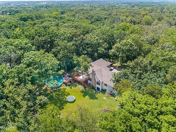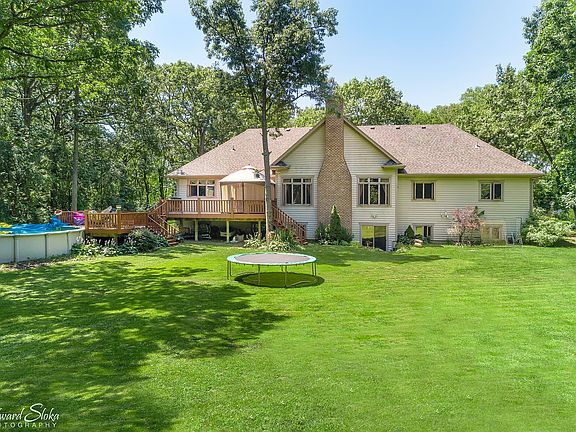 This beautifully built custom home on 3 wooded acres located on private cul-de-sac has details throughout. Spacious and open floor plan great for entertaining with custom barn beams, wood details galore and hardwood oak floors. Entry into home presents with slate floors with view into cathedral ceilings in sunken great room with stone fireplace and second story overlook is breathtaking with wall of windows. Enjoy the tranquil front porch with the picturesque views of the outdoors (ceiling outlets to decorate for the holidays). Many exterior areas to enjoy the wildlife and serenity including above ground pool surrounded by Trex decking. New roof 2019. Large kitchen granite countertops, custom hickory cabinets, breakfast bar, large pantry and eat-in area are a must see. Master bedroom has tray ceiling with master bath barrel vaulted ceiling over Jacuzzi tub. Walk out finished basement with touches of slate, built in bar, rec area, stone fireplace, full bath, heated floors, addtl bedroom