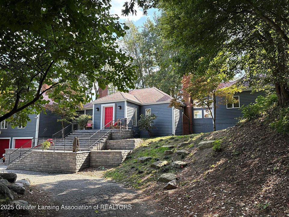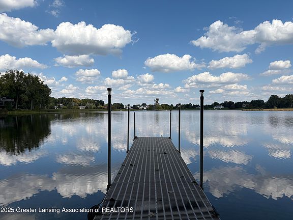 All-Sports Scenic Lake, unique contemporary home on a serene 2.2-acre peninsula with nearly 700 ft of lake frontage and absolutely stunning views! Cross over a small bridge down a private drive to a little piece of paradise! This home provides comfort and luxury - offering 4 Bedrooms, 2.5 Baths, and over 5,000 square feet of living space! Dramatic stone step entry with lake views the moment you enter the inviting foyer, open to a spacious great room, boasting hardwood floors, 2 gas fireplaces, and custom wall-to-ceiling windows with panoramic lake views! Kitchen is a chef's dream with gas fireplace and informal eating that leads to extensive wrap-around deck with screened gazebo, overlooking nature and lower deck area encompassed by perennials - offering a perfect space for entertaining friends & family. Roomy primary suite with see-through fireplace & sitting area, walk-in closet, and deck access with a finished gazebo used as office space - ideal to enjoy your morning coffee while relishing naturistic views. En suite with soaking tub and lake view window, walk in ceramic shower, and separate vanities. Laundry room with cabinetry and counter space next to 2nd bedroom. Rejuvenate in the sauna! Two more substantial bedrooms with ample closet space share a full bathroom and each has walkout access to the lower deck. Plenty of storage space in the garage and additional attached storage for your atv or water toys and dog run. Plenty of storage, 3 furnaces & 3 A/C units, 2 hot water heaters, & slate tile roof. Watch the migratory patterns of the geese, ducks and sandhill cranes from the boardwalk along sandy beachfront with low maintenance roll-in dock. The sun rises over the east bay and sets beyond the west bay illuminating the private beach on all-sports Scenic Lake. Enjoy year-round water activities from your private sandy beach and lakefront boardwalk. The perfect oasis! The Scenic Lake Association, includes a private park with sandy beach, volleyball court, play structure, & boat launch. Enjoy annual activities including 4th of July fireworks, end of summer glow party, and more! Minutes to I-69, Okemos, & East Lansing. Discover Lansing's best kept secret!