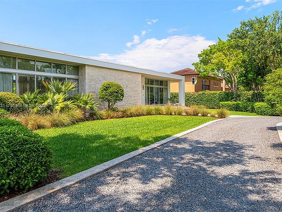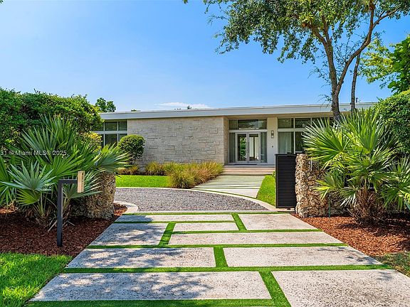 This 1-story contemporary custom home welcomes you w/ a gated entrance and an Oolite stone wall, ensuring privacy & security on a beautifully landscaped green lot. Step inside to discover high ceilings & abundant natural sunlight streaming through high-impact windows. The interior features polished concrete & hardwood floors throughout. The home includes 3 bed rms with ensuites, & an additional bed rm converted into an office/den. The primary suite ft. a spacious layout, a walk-in closet, & a spa-like bath rm w/ a soaking tub, a glass-enclosed shower, & dual vanity. The open kitchen boasts solid wood cabinetry, Gaggenau & Bosch appliances, & a marble waterfall kitchen island that opens to the family rm, offering tropical oasis views of the oversized pool, patio, & lush greenery.