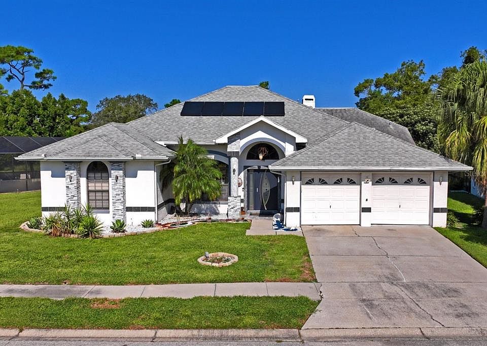 Why wait to build, very cozy in a great neighborhood, pool home. 3 bedroom, 3.5 baths, 2 car garage. Well maintained and move in ready! With lots of great touches. As you enter the home through the front door to a living room overlooking a pool area and a conservation area in the back of the home. Great for entertaining or just relaxing with your morning coffee. Wood burning fireplace in the family room. The kitchen is bright and open, featuring some newer appliances, refrigerator and washing machine are " SMART ", recessed lightning. Large master bedroom with a walk-in closet. Master bath boasting a wonderful soaking tub and walk-in shower. Ceramic tiles thru out the home giving it a clean, sleek look. Screened back 22 x 18’ extended lanai is under roof, just off the master bedroom, living and family rooms for easy access. The low HOA fee of $250 a year covers maintenance of the common areas. Great friendly neighbors that will welcome you. NO FLOOD insurance needed. Located down the street from shopping, restaurants and a short trip to the prettiest beaches around. Few minutes drive to historic down town New Port Richey and Sims Park where something is always happening on the weekends! As well attractive Tarpon Springs with its Sponge Docks, Anclote Beachy, Key Vista Park and many more attractions! Short drive to Tampa International Airport. Come see it today!