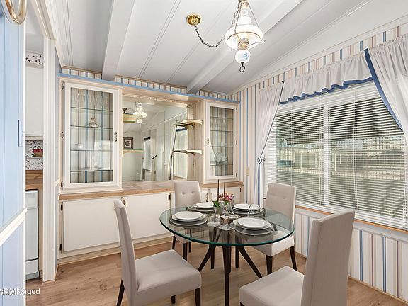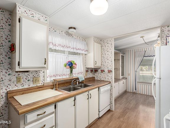 2 bed, 2 bath ground-set home in Holiday Palms 55+ Resort. Spacious living room with vaulted ceilings, dining room with built-in hutch, and galley kitchen with ample storage. Slider opens to 3-season AZ room with laundry area. Primary suite fits king bed, has ensuite tub/shower and large mirrored closet. Guest room fits queen, with full hall bath. Laminate in kitchen/dining, vinyl in baths, carpet elsewhere. Covered back patio, deep carport with shed, and fenced backyard with grapefruit trees. AC approx. 3 yrs old. Perimeter lot across from pool & clubhouse. Photos are virtually staged with furniture.