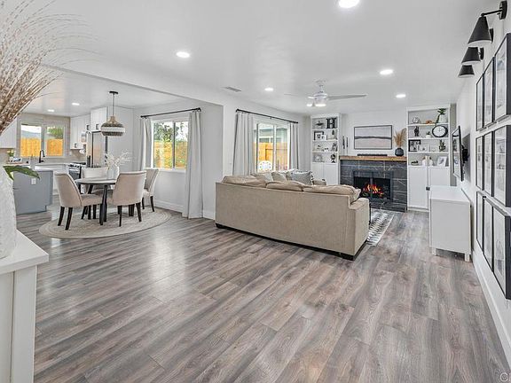Stunning Remodeled Home with Mountain Views and Exceptional Outdoor Living. This beautifully remodeled 4-bedroom, 2-bath home offers modern comfort and style in a prime west-end location of Santee. Situated on a cul-de-sac, you'll enjoy breathtaking mountain views and proximity to Mission Trails, Mast Park, and Santee Lakes. Step inside to find a spacious living area featuring a cozy fireplace with custom built-in bookshelves. The sleek, remodeled kitchen is a chef’s dream, complete with white shaker cabinets, newer appliances, and ample counter space. Both bathrooms have been fully remodeled with contemporary finishes, creating a luxurious and modern retreat. The outdoor space is equally impressive, with a newly resurfaced patio that includes a stylish cover, ceiling fans, shades, and misters to ensure year-round comfort. The lush backyard is complete with artificial turf and a garden area, offering endless outdoor enjoyment. Additional features include solar, a freshly updated, eco-friendly front yard, a two-garage with epoxy flooring, gutters, and a new fence for added privacy. This home perfectly blends modern convenience with outdoor luxury in a sought-after location. Don’t miss the opportunity to make this stunning home yours!