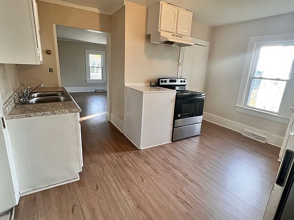Inside, you'll find three spacious bedrooms, one full bath, and warm living spaces. The kitchen features stainless steel appliances, while solid-surface flooring flows throughout the home, adding both style and easy care. A generous lot provides room for outdoor living and landscaping, with convenient rear parking access.