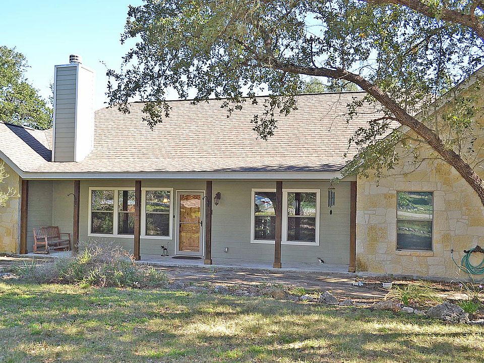 3 Br/2 Bath Split Floorplan W/Oversized Attached Garage In A Fantastic Location! Unique Features Include All Stained Concrete Flooring, Beautiful Countertops, Copper Sinks, Huge Master Suite And More. Home Backs Up To Large Ranch Providing Privacy & Seclusion. 3 Community Parks Including Guadalupe River Access and community pool! One Of A Kind unique Craftsmanship throughout from flooring, doors, windows to ceiling treatments. Awesome view w/500AC ranch in back, additional workshop in garage. 1 acre/2lots