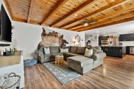 - Beamed Ceilings, Ceiling Fan(s), Solid Surface Counters, Eat-in Kitchen, Kit/Din Combo, Kitchen Island, Liv/Din Combo, Live on One Level, Master Downstairs, Quartz Countertops, High Ceilings