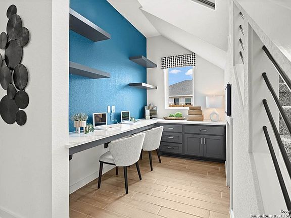 Chesmar Homes Davis plan - Welcome home to your 4 bed, 3 bath home with a study, game room AND built-in tech center. Vaulted ceiling family room ceiling with large windows. Kitchen island overlooks the spacious family room and breakfast area for a truly open concept space. Well-appointed finishes, including upgraded tile flooring, quartz countertops, and upgraded cabinetry with soft close drawers. Primary retreat boasts separate vanities, large walk-in shower, and large walk-in closet. Secondary bedroom with full bath downstairs. Upstairs features a large game room PLUS two secondary bedrooms and a full bath. Full sod, sprinkler, covered rear patio and more! ESTIMATED FEBRUARY MOVE IN. PHOTOS ARE REPRESENTATIVE OF THE FLOORPLAN.