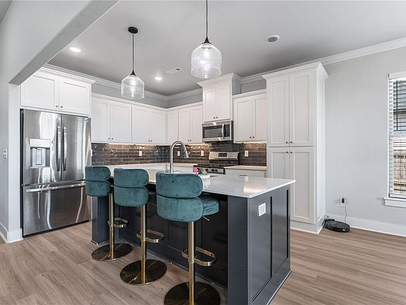 The chef’s kitchen features quartz countertops, stainless appliances, a gas range, and designer backsplash—perfectly connected to the dining and living spaces. A dedicated office with built-ins and a spacious mudroom/laundry add convenience.