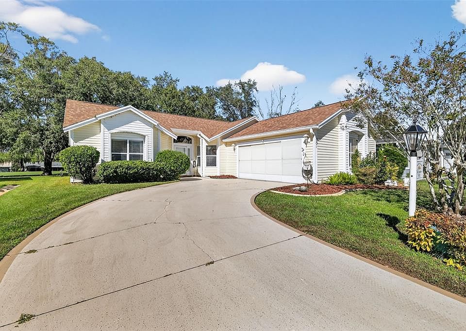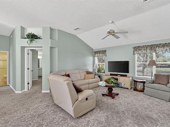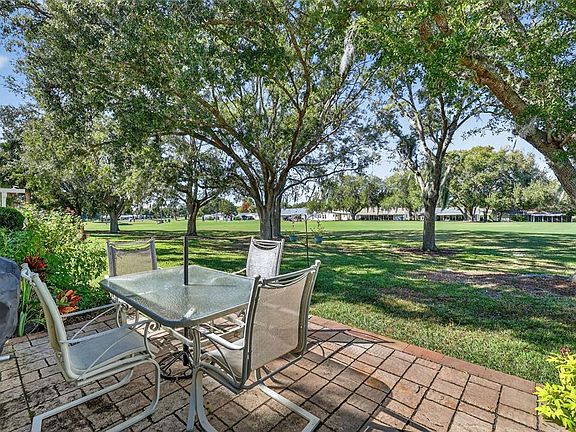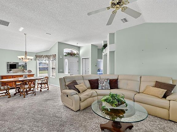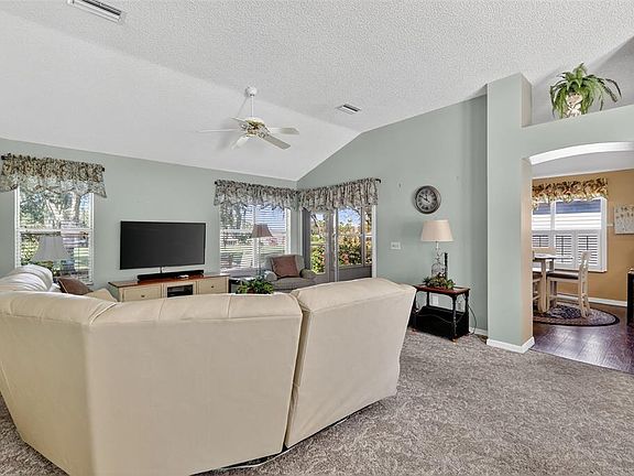 Looking for an attractive style home with a Serene Golf Front View? This SITE BUILT Designer Coronado Model with side entry Garage is a must see. This 2 Bedroom 2 Bath Open Concept Layout offers an extra large Country Kitchen, plus, a Living Rm/ Dining Rm Combo overlooking The Orange Blossom Championship Golf Course. Once inside you'll notice the Decorative Archways on both sides further accented with Vaulted Ceilings. The Eat In Kitchen also features a Breakfast bar and an additional dinette area with sliding doors to your enclosed Lanai that also overlooks the golf course. There are Granite counters, newer Stainless Steel Appliances, Double Sink, an abundance of Cabinetry with Pull Out Shelving and deep cooking pot drawers, Plantation Shutters and updated Vinyl Flooring. On the other side of the home is the Primary En-Suite with Walk In Closet, Double Sink Vanity, updated Walk- In Shower and a Private "Toilet Closet." The Guest Bedroom and closet are a nice size, plus just outside the door, is the remodeled Guest Bath with a beautiful Tilled Walk-In Shower, Light & Bright Vinyl Flooring that is further accented by a pastel color Vanity and solid surface top. Other Features of this updated home include a rear 15 X 11 Elevated Brick Paver Patio where you can enjoy lunch with a view!! Another attractive feature is your curved driveway leading to the roomy side garage that will easily fit your car, & the must have Golf Cart, plus some room for storage. There are also pull down stairs to access the above space. NOTE: 2024 Roof, 2019 HVAC, 2019 Hot Water Heater and NO BOND! Call Me for your Private Showing!