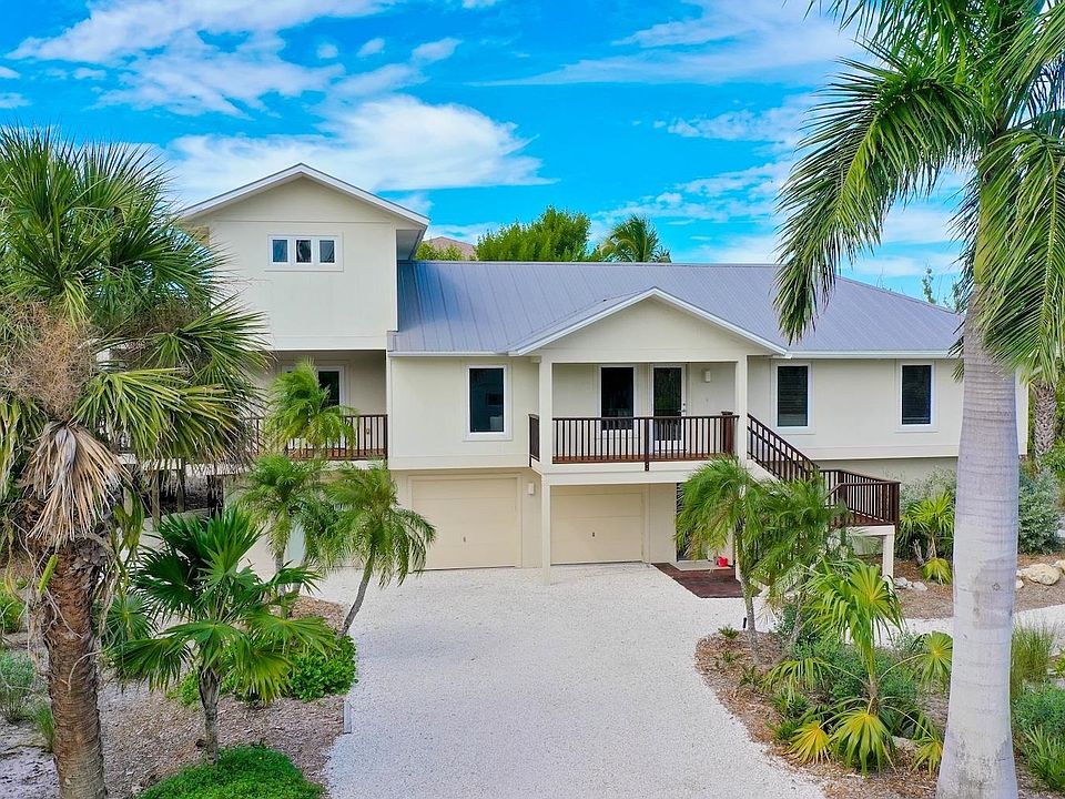 Just four lots from the beach, this beautifully remodeled 4-bedroom, 4-bath home offers the perfect blend of coastal charm and modern comfort. Step inside to find spacious open living with bamboo flooring, vaulted wood ceilings, and a bright kitchen and dining area featuring granite countertops, a Bosch range, and a Bosch dishwasher. The main level includes three bedrooms and three baths, plus a versatile den/office and a welcoming living room that opens to a large veranda surrounded by lush tropical landscaping. A walk-in pantry, laundry room, and convenient grilling porch are located just off the kitchen. Upstairs, the private primary suite offers a tranquil retreat with double closets featuring custom systems, bamboo flooring, and vaulted ceilings. The spa-inspired bath showcases travertine tile, a separate shower and soaking tub, and access to an expansive open sundeck — perfect for morning coffee or sunset views. The home’s exterior is designed for durability and low maintenance with Hardie Board siding, a stucco lower level, metal roof, all high-impact windows, and Pau Lope wood decks, stairs, and railings. The lower level includes a two-car garage, workshop, dedicated kayak storage, and an outdoor shower. Located just steps from the beach and diagonally across from the community pool and tennis courts, this home offers the ultimate beachside lifestyle — move-in ready and truly picture perfect!