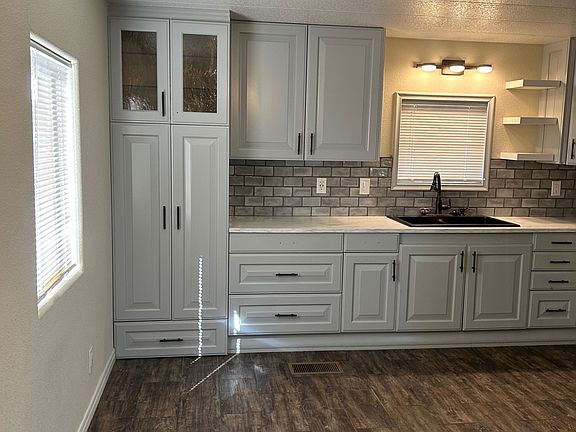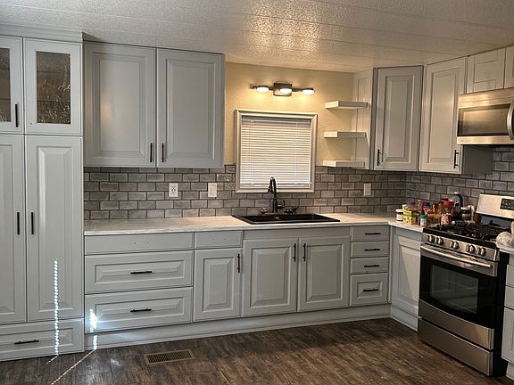 Family Park Remodeled home. Wait til you see what they have done to this home. Double door entry, key or keyless pad entry, Completely new kitchen including cabinets and with a great new gas stove/oven. New floors, textured walls, and light fixtures. Check out the bathroom all of it is new including the large square head shower. This is the perfect home for a small family or a starter home. Conveniently located near the pool and park amenities. Unique corner location for easier access parking for your guests. Includes the front short storage shed and the one in the back. Sorry but this home will require a cash buyer.