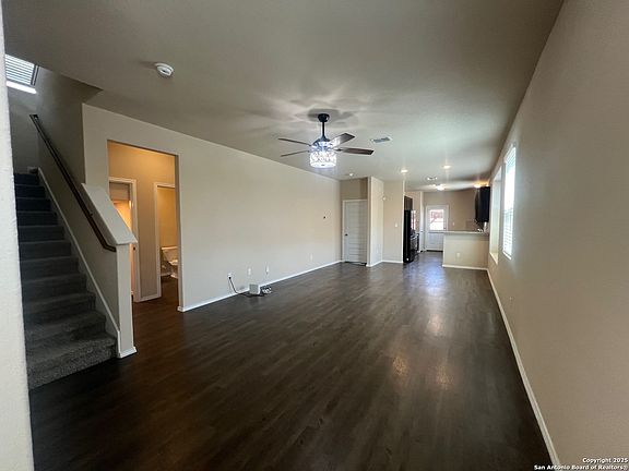 Located just minutes from Lackland AFB, SeaWorld, and Downtown San Antonio, this home offers the perfect blend of adventure and convenience. Whether you're headed to base, enjoying local attractions, or commuting downtown, you'll love how accessible everything is from this prime location. From the moment you enter, this home welcomes you with style and functionality. The open-concept first floor creates the ideal space for entertaining, featuring a bar-top kitchen that flows effortlessly into the spacious family room-perfect for gatherings or cozy nights in. The gourmet kitchen is a chef's dream, boasting 42" cabinetry, granite countertops, and plenty of prep space for all your culinary creations.