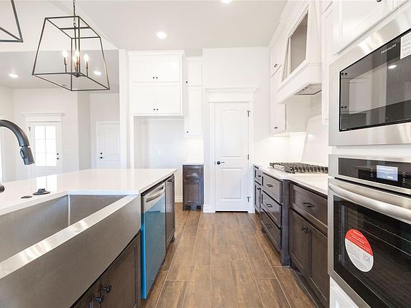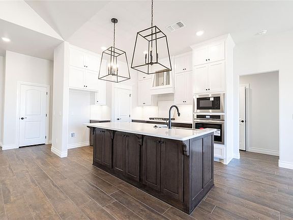 This Hummingbird floor plan features 2,025 Sqft of total living space, which includes 1,800 Sqft of indoor space and 225 Sqft of outdoor living. There is a 565 Sqft, three car garage with a storm shelter installed. This home offers 4 bedrooms, 2 bathrooms, 2 covered patios, and a large utility room. The great room welcomes a breathtaking cathedral ceiling, a gas fireplace with our stacked stone surround detailing, large windows, wood-look tile, and Cat6 wiring. The high-end kitchen has 3 CM countertops, custom-built cabinets to the ceiling, soft close drawer glides and hinges throughout, stainless steel appliances, a 5-burner cooktop, vogue tile backsplash, stellar pendant lighting, a corner walk-in pantry, and a large center island equipped with a trash can pullout, farm sink, and dishwasher. The elegant primary suite has a sloped ceiling detail with a ceiling fan, windows, and our cozy carpet finish. The attached spa-like bath includes a dual sink vanity, TWO spacious walk-in closets, a roomy walk-in shower, and a free standing tub. The covered back patio offers a wood burning fireplace, a TV hookup, and a gas line for your grill. Other amenities include Healthy Home Technology, a fresh air ventilation system, a tankless water heater, R-44 insulation, and more!