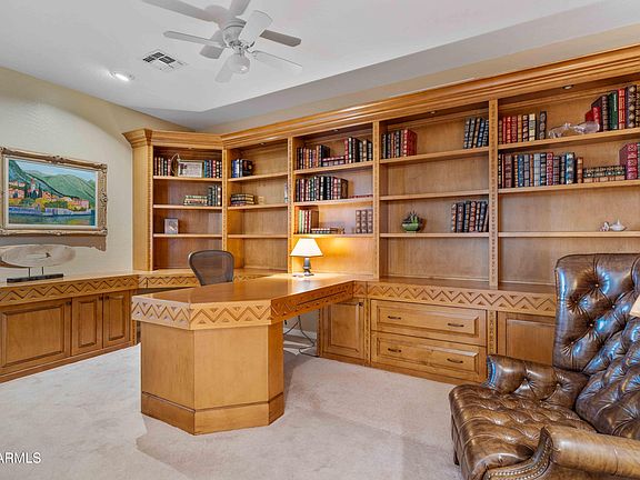 The home you've been holding out for just hit the market & it checks ALL the boxes. THIS IS A UNICORN LOT. Newer Roof, Newer A/C, Newer Flooring, Newer pool, Giant Lot, Great Entertaining Space, Custom Den, Meticulously cared for by Current owners- This home truly has it all! This home is well kept and clean and updated with gorgeous wood look tile floors throughout. Beautiful double door entry to formal living and dining area on one side and custom built library on the other side- perfect for working at home or holding all your books/hobbies. Step into the vaulted kitchen with cabinets &counters that extend for days- Kitchen has inductive stove top and newer smudge resistant stainless appliances. Kitchen is also equipped with many pull out drawers in cabinets & beautiful quartz counters. Kitchen is also equipped with many pull out drawers in cabinets and beautiful quartz countertops. Stand at the kitchen island and still be part of your perfect entertaining great room with a cozy fireplace for those chilly Arizona mornings and evenings. Built in bookshelves are perfect in this space. Also on the main floor- Oversized primary bedroom with doors that lead out to the patio. His and Her Closets and large walk in shower and updated bathroom. Upstairs you will find two additional oversized bedrooms with a full bathroom. Upstairs has its own A/C so you can use it when you need to and save the money when you don't. Outside off the back of the home is an extended patio perfect for entertaining with a wood fire pit area, newer pool with large Baja shelf and a pergola perfect for the shade. If you've been wanting to get into Sun Lakes this is THE LOT you've been looking for.