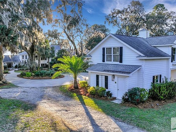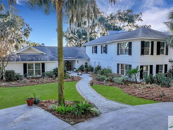 Incredible waterfront views on tidal creek looking down Vernon River, where sunsets are amazing! 5 bed 5.5 baths plus 1,000 SF climatized space above detached guest house- garage. Gorgeous marsh views from main house family room w/ fireplace, dining room & gourmet kitchen. Crown moulding, coffered ceiling in living room, solid wood doors throughout. Addl spacious home theatre/den. Large primary bedroom has beautiful marsh views; marble bathroom w/ walk-in double shower, large free standing tub & two vanities w/ quartz countertops.