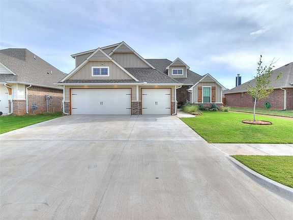 Beautiful 4-bedroom, 3-bath home with open layout and modern finishes! The kitchen features a large island with storage and plugs, quartz countertops, tile backsplash, slow-close drawers, coffee bar, 4-burner gas cooktop, built-in oven and microwave, plus a spacious pantry and USB-C outlets. The inviting living room boasts a vaulted ceiling, fireplace with wood beam and mantle, and a dining area perfect for family gatherings. The primary suite includes double vanities, whirlpool tub, two closets, three-season closet, walk-in shower, and vaulted ceiling. Upstairs bonus room with full bath and attic access. Enjoy the spacious back porch with built-in fireplace overlooking the large yard—ideal for relaxing or entertaining! Three-car garage with storm shelter and storage, tankless water heater, sprinkler system, blinds throughout, and large laundry with hanging bar complete this move-in-ready home!
