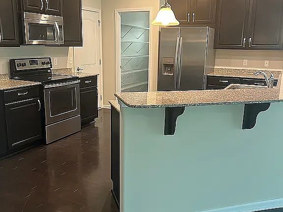 The formal dining room opens into an eat-in kitchen featuring granite countertops and stainless steel appliances, perfect for gatherings and everyday living.