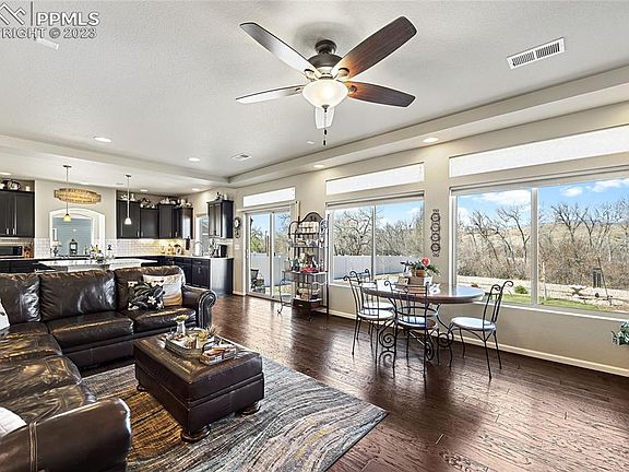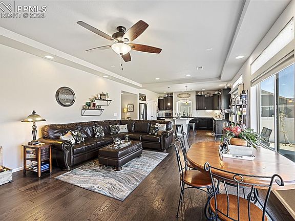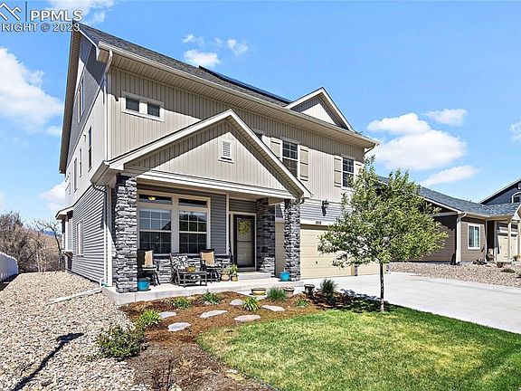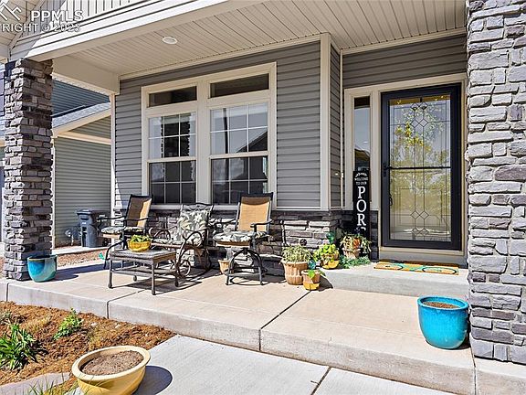 You will fall in love with this immaculate home nestled on a quarter acre that backs to the Cumberland Green Open Space. Greeted with a ton of curb appeal and a welcoming covered porch, it's not hard to imagine yourself sitting outside and enjoying your morning coffee. Step inside to find tall ceilings, large windows letting in a lot of light, and pristine engineered hardwood floors that flow throughout the main level. Head through a formal living and dining area into a dreamy kitchen with stainless steel appliances, granite counters, a large pantry and a center island with a bar. Huge kitchen offers plenty of room for the holiday events, seamlessly flowing into the family room. The upper level features a spacious primary suite with stunning mountain views, a walk -in closet and adjoining oversized 5 piece spa like bath. Enjoy three additional bedrooms, full bath, and a loft. Head upstairs to a huge bonus room sealed off with custom barn doors and views of Pikes Peak. This home is immaculately maintained with a thoughtfully executed floor plan and loads of upgrades! Recessed lighting, coffered ceilings, granite counters, stunning landscape, sprinkler system and so much more. Close to Fort Carson, Peterson AFB, shopping, golf courses, and schools. This is a must see home.