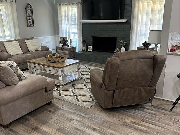 New pergolaOpen floor planOversized primary bedroomDouble vanitySeparate stall showerBrick fireplaceCathedral style ceiling