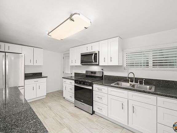 Step into a beautifully remodeled 4 bedroom, 2 bathroom home that's been updated inside and out. Enjoy the sleek look of 12x24 inch tiles laid throughout the entire house, complemented by a new kitchen featuring soft-close cabinets, granite countertops, and all-new appliances. Brightened by new windows and stylish light fixtures, with updated tile showers, a new roof, and an efficient AC unit, this home is turn-key ready. Outside, the large covered patio offers additional space for relaxation or entertaining, while a spacious 216 sqft detached storage room provides versatile options for storage, a home gym, or a workshop. The home sits on a generous lot with a sizable front yard.