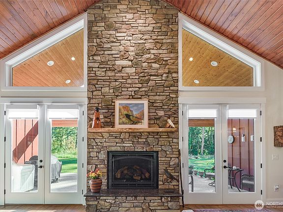 Expansive covered patioPine ceilingsHeated floorsMaple live edge mantleUpgraded stainless appliancesMarble countertopsSerene nature