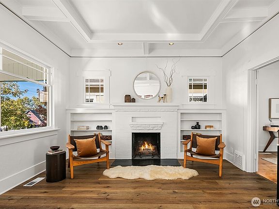 Gorgeous Craftsman with Vintage 1915 charm intact is updated for today with updated electrical (no knob & tube left), Earthquake Retrofit, Mini-splits for heating & AC in 2 of the 4 bedrooms, and a 1-car garage with electric car charger & roof with 50 year shingles. Living & Dining rooms feature 9ft ceilings with beautiful box beam detailing. The wood burning fireplace is flanked with built-ins. The Kitchen w/ new cabinets & countertops opens to a back deck w/ electric awning & heating for all-year outdoor gatherings. Delightful Plum & Cherry trees & tons of garden/play space. The 880sf unfinished basement has an exterior entrance – great storage and future potential. Fab locale, a few blocks to Madrona parks, shops & eateries.