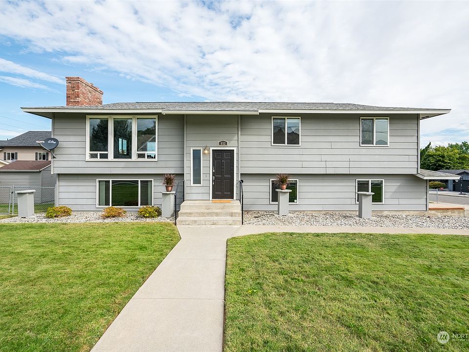 Modern touches throughout including: a custom iron railing on the stairs with a built-in gate, updated kitchen and bathrooms, Luxury Vinyl Plank flooring, new paint throughout the home, AND a freshly painted deck! This 3 bedroom, 3 bath home has 3 bedrooms and 1.75 baths on the main floor, including a Primary Suite and the lower level has a spacious second living room and another 3/4 bath. Huge windows and deck show a beautiful view of Saddle Rock. Located in close proximity to the hospital and schools. This lot has loads of parking, including room for RV parking and fully fenced backyard with shed and garden space.
