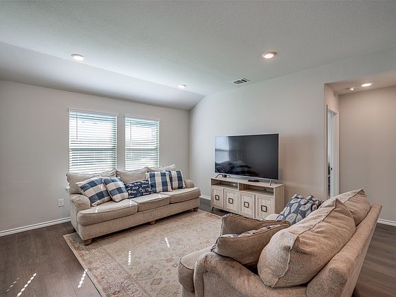 The open living area features vaulted sightlines to an eat in kitchen with granite counter tops, spacious island, walk-in pantry, electric range, microwave, dishwasher, and disposal. Interior finishes include laminate wood floors, tile, and carpet, recessed lighting, and convenient utility room with a full size washer and dryer area.
