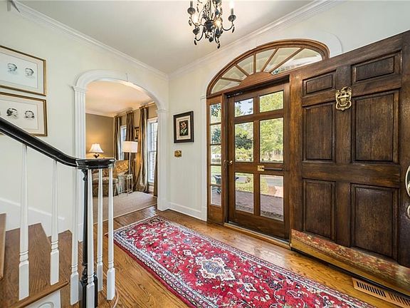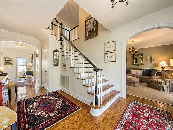 Southern exposure with expansive waterfront views. Solid oak flooring will greet you at the grand foyer & will lead you through your forever home. Formal dining room with marble flooring & fireplace. Glass-wrapped living room with bar & wine cooler. Stamped concrete terrace connects to the portico with juniper-lined ceiling. Primary suite offers picture window with breathtaking views, 2 walk-in closets, steam shower with multiple shower heads & soaking tub. Guest suite on first floor. Dedicated home office or gym. Finished room over the garage. Permanent stairs to attic. Garden house & Pier.