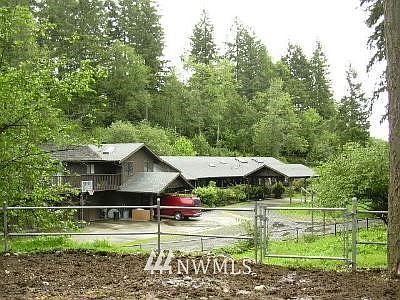 This home is on a private 2.25 acres with a 5 car garage (or 4 car plus shop). There is a barn and outbldgs. For your animals, a shop, and a office with a bathroom in the garage. This home is unique with its high ceilings, it looks like a chalet in the woods. The home has another office/weight rm, and a covered porch area adding almost 500 sq Ft to the home.