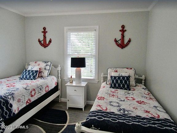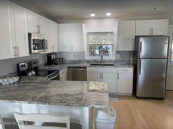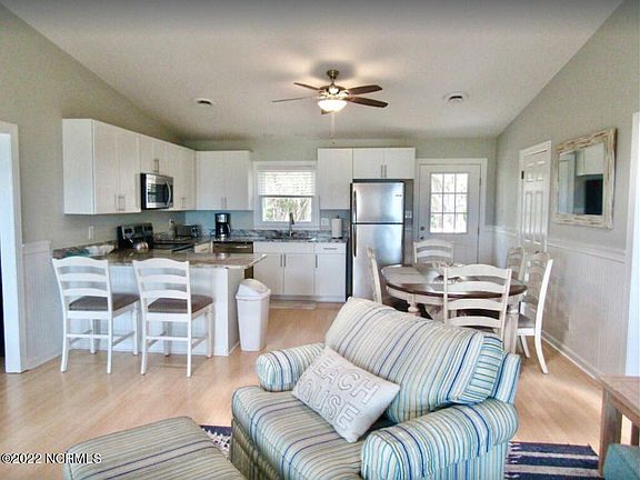 This lovely 2nd row home sits on a high lot off Coast Guard Road. The home has a traditional beach house layout of 2 bedrooms on each side with a full bath between (total of 4 BR and 2 full bath) and a large open living room and spacious kitchen in the center. The two bedrooms toward the front of the house each have a queen bed and sliding glass doors accessing a large front deck with fantastic sweeping ocean views, steps from the ocean (2 minute walk to the sand from the end of the driveway). The two bedrooms toward the rear of the house have 2 twin beds in each room. This completely renovated beach house offers a beautiful Trex deck, kitchen with new cabinets, new granite counter top and stainless steel appliances. The central living space offers newly refinished bamboo floors. Hardy plank siding was installed in 2018 along with new windows throughout. Central AC (new in 2019), ceiling fans throughout, washer/dryer, and dishwasher. Downstairs is an unfinished space for storage, as well as a separate laundry room. There is a rebuilt outside shower with hot water. This home offers a private tranquil setting, yet only five minutes to shopping and entertainment. A gorgeous sandy white beach is literally right across the street.