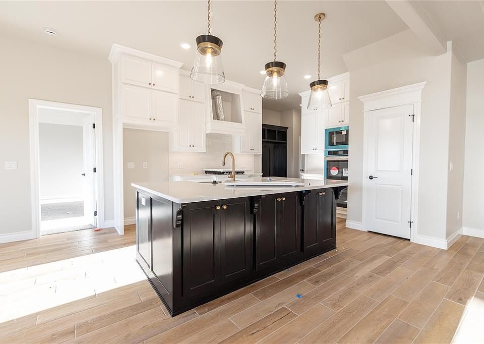 This Cornerstone Bonus Room-5 bedroom floor plan includes 3,230 Sqft of total living space, which includes 2,950 Sqft of indoor living space and 280 Sqft of outdoor living space. This spectacular home offers 5 bedrooms, 3 full bathrooms, 2 covered patios, 2 dining areas, a spacious study, a mudbench, a utility room, and a 3-car garage with a storm shelter installed. The great room welcomes a gorgeous, coffered ceiling with a ceiling fan, a gas fireplace with our stacked stone surround detail, large 7' windows, rocker switches throughout, and wood-look tile. The breathtaking kitchen features stainless-steel appliances, including a 5-burner cooktop and double ovens, decorative tile backsplash, 3 CM countertops, a center island with a trash can pullout installed, stunning pendant lighting, a separate pantry, and custom-built cabinets to the ceiling. The attractive primary suite boasts a sloped ceiling detail, our carpet finish, windows, and a ceiling fan. The prime bath features separate vanities, a walk-in shower, a free-standing tub, and a HUGE walk-in closet. Outdoor living supports a wood-burning fireplace, a TV hookup and a gas line. Other amenities include a whole home air filtration system, a tankless water heater, R-44 insulation, and more!