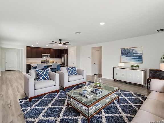 Motivated Seller! Price change. All appliances convey* Welcome to this beautifully upgraded one-story home that perfectly blends style, comfort, and function. The open-concept layout is bathed in natural light, creating a bright, airy feel from the upgraded kitchen to the spacious living area. The kitchen itself is just as inviting-featuring a large eat-in island that's perfect for casual dining, gathering, or meal prep. The primary suite offers a quiet retreat, complete with a renovated bathroom featuring a double vanity, upgraded tiled shower, and large walk-in closet. Throughout the home, upgraded flooring and remote-controlled dimmable ceiling fans add a sleek, modern touch. Three additional bedrooms-each with walk-in closets-give you the space you need, along with a full secondary bathroom. Smart thermostats and a water softener system add convenience, while the two-car garage features built-in shelving and upgraded epoxy flooring for added utility and polish. Outside, enjoy low-maintenance landscaping with turf across the backyard, rubber mulch along the sides, and fresh garden beds in the front. This move-in ready gem is conveniently located near Randolph AFB, with nearby shopping and entertainment. Schedule your showing today!