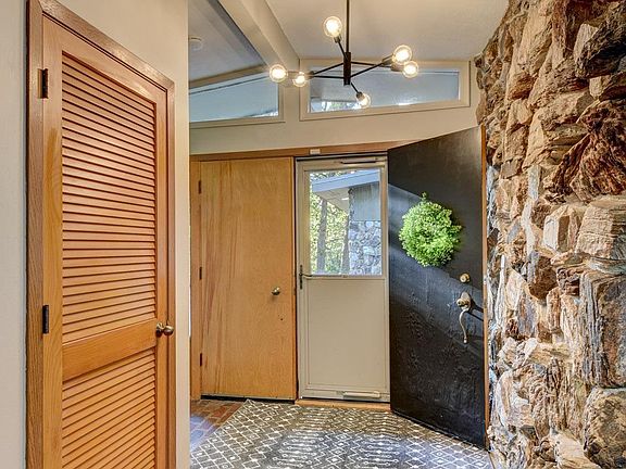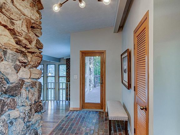Tucked among the trees on Oak Street, this contemporary District 66 mid-century ranch offers both character and calm in one striking package. Its shallow roofline and blend of wood and stone integrate seamlessly into the natural setting. Expansive deck and brick paver patio below create a private outdoor retreat surrounded by mature trees. At the entrance, double doors open to a central foyer with complimentary brick and stone. The open Euro-style kitchen features a large Boos Block island and overlooks the sunken living room with floor-to-ceiling windows and a Jøtul cast-iron stove—bringing the outdoors in. Main-floor bedrooms showcase beautiful, ever-changing seasonal views. The finished lower level adds a bedroom, office, and additional living area. A spacious mudroom connects the home and garage and retains the original built-in BBQ grill and smoker—a true mid-century gem. Oversized two-car garage with storage. Homes like this are rarely available. Pre-inspected for peace of mind.