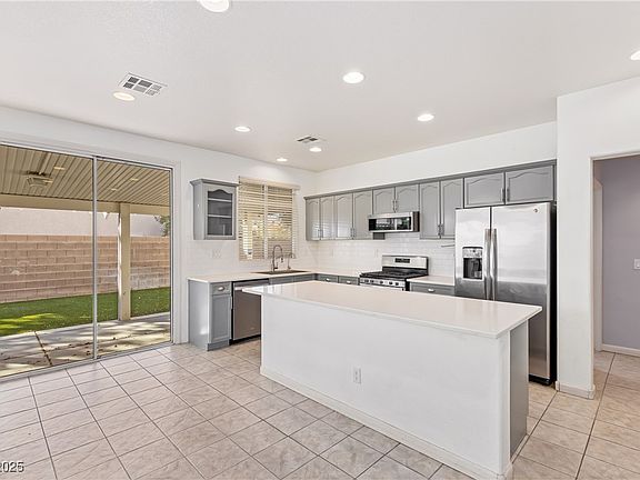 Spacious and inviting, this beautiful 4-bed, 2.5-bath home w/Solar in Centennial Hills offers comfort, functionality, and style. Featuring a desirable 3-car garage with epoxy flooring, this residence welcomes you with an open-concept layout that includes both a living and family room with elegant laminate flooring. The family room features a cozy fireplace and built-in shelving. The large eat-in kitchen is a chef's delight, complete with an island, tile flooring, recessed lighting, pantry, and plenty of counter space for meal prep and gatherings. One bedroom and a three-quarter bath are conveniently located downstairs, ideal for guests or a home office. Upstairs, you'll find a spacious loft providing additional living or flex space. Enjoy outdoor living under the large covered patio overlooking the expansive backyard perfect for barbecues, play, or simply unwinding. Conveniently located near schools, parks, shopping, and freeway access. Solar is owned and power bill is very low!