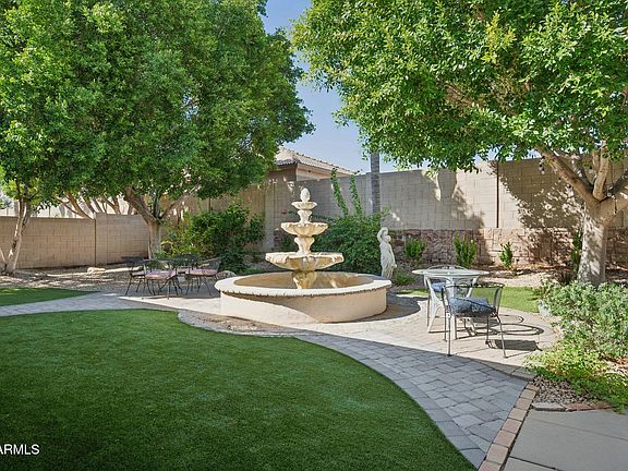 The well-appointed kitchen features shaker-style cabinetry, granite countertops, a large island, and a walk-in pantry—perfect for any home chef. The owner's suite is a true retreat with private patio access, a spa-inspired bath, and windows that frame views of the lush backyard. Two guest rooms share a convenient Jack and Jill bath. Outdoors, enjoy a private corner lot surrounded by mature trees, a soothing fountain, and mountain views. The backyard's built-in BBQ and lounge areas make it ideal for gatherings or quiet relaxation. Located in scenic northeast Mesa. This home offers comfort, beauty, and value in one inviting package.