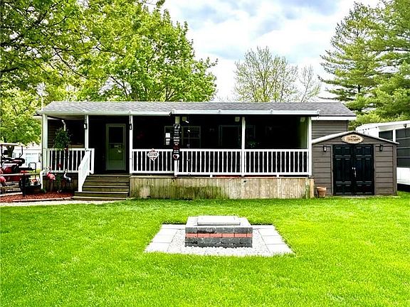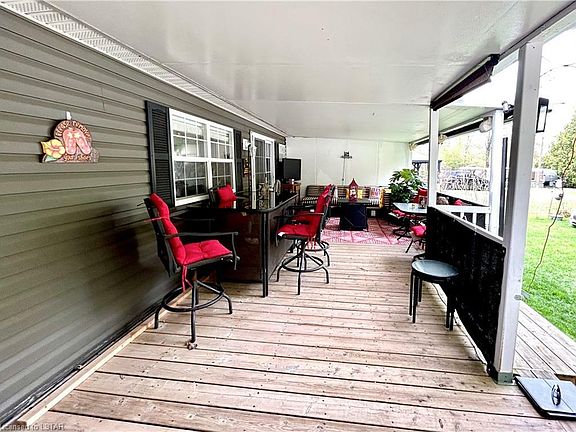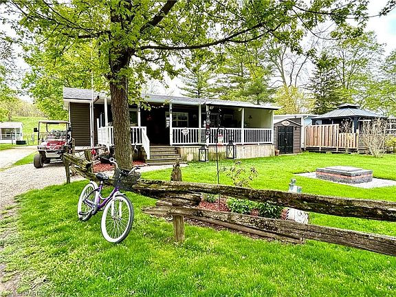Immaculately cared for 2 bed/1 bath summer home on manicured, landscaped site at Ipperwash Beach! Modern, open concept layout offers a spacious living room area with built-in fireplace for cozy evenings, and features an ample kitchen with espresso cabinetry, full-size stainless steel applicances, double sinks and built-in bankette seating. Vaulted roof with elevated windows make the space bright and airy, and windows tip in for easy cleaning. The 4 pc bath has a full tub, the queen size primary bedroom has built-in storage spaces and a double closet, and the second bedroom contains 2 single over queen bunks, one of which can be converted to a table and seating making this an incredibly versitile space. The large covered porch with privacy curtains and sliding door access to kitchen makes outdoor dining and entertaining easy and enjoyable, and has steps down to the large yard with firepit. Situated at Our Ponderosa Campground a quick walk or bike ride to stunning Ipperwash Beach, the park features something for everyone! There are 3 swimming pools, playgrounds, shuffle board, pickleball, basketball, mini-golf, community events and a private 9 hole golf course! The area features some of the best beaches in Ontario, with restaurants, artisan shops, markets, theatres, wineries, hiking and biking trails nearby, and is within an easy drive of London, the GTHA, and the US border at Sarnia.