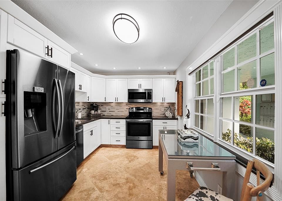 Inside, enjoy 24” x 24” travertine marble throughout, creating a clean, elegant flow. The renovated kitchen features granite countertops, stainless steel appliances, and a 3-door refrigerator, along with a newer washer and dryer.