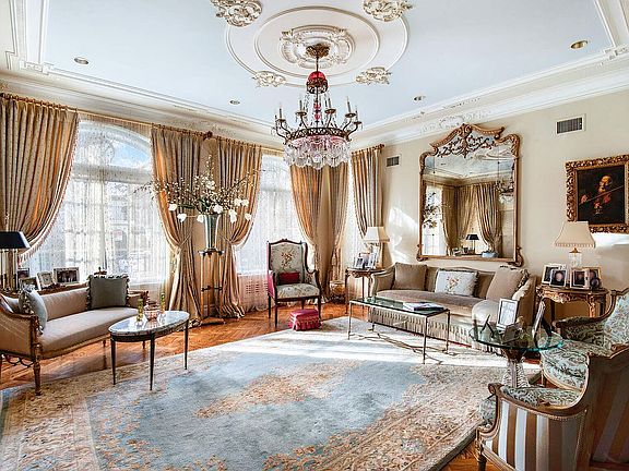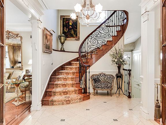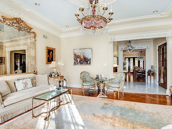 Main Level: Timeless Elegance A dramatic marble-clad foyer welcomes you, leading to a sweeping wrought-iron and wood staircase illuminated by a soaring three-story stained-glass window. The living room evokes a Parisian salon with handcrafted ceilings, custom moldings, and oversized windows. The stately dining room-ideal for lavish entertaining-opens to the gourmet kitchen through a wall of stained-glass doors. A powder room adorned with Italian onyx, marble, and hand-painted gold leaf completes the level with a glamorous flourish.