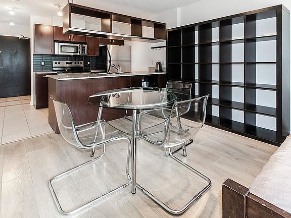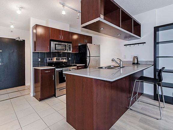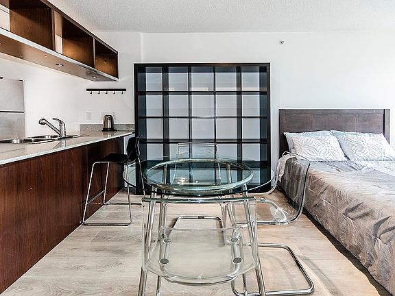 The home offers a large bathroom with in-suite laundry, full size kitchen with lots of cabinets with ample countertop space, stainless steel appliances, open living/dining/bedroom area, updated laminate flooring, floor to ceiling windows and large south east facing outdoor space. The building amenities include rooftop gardens with beautiful views, 24hr concierge, bike room, a well equipped gym,theatre/lounge/meeting room. Internet and electricity are included. Parking is not included. The kitchen is not equipped.