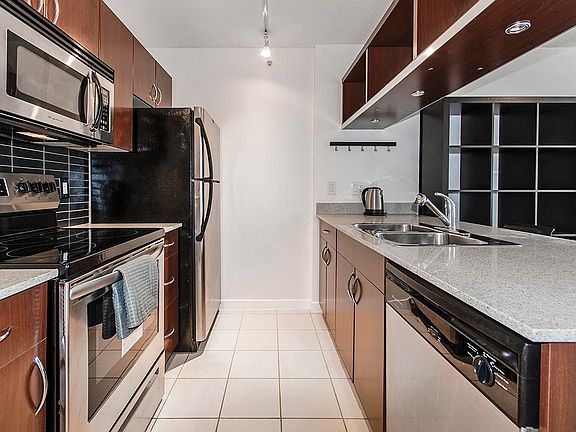 Ample countertop spaceStainless steel appliancesUpdated laminate flooringFloor to ceiling windows
