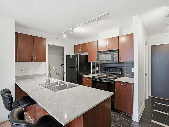 Welcome to Electric Avenue by Bosa - a sought after downtown address offering comfort and convenience in the heart of it all. This bright, well-designed home features two spacious bedrooms, each with walk-through closets and ensuite bathrooms, providing excellent privacy. Enjoy laminate and tile flooring throughout, an updated washer/dryer, quartz countertops, and a handy pantry and flex/office space. Overlooking the quiet courthouse roof, the suite offers a peaceful outlook amid the vibrant city. Steps to Robson Street shops, top restaurants, movie theatre, and groceries. Includes secure underground parking, a fitness centre, and 24-hour concierge. Urban living at its finest.