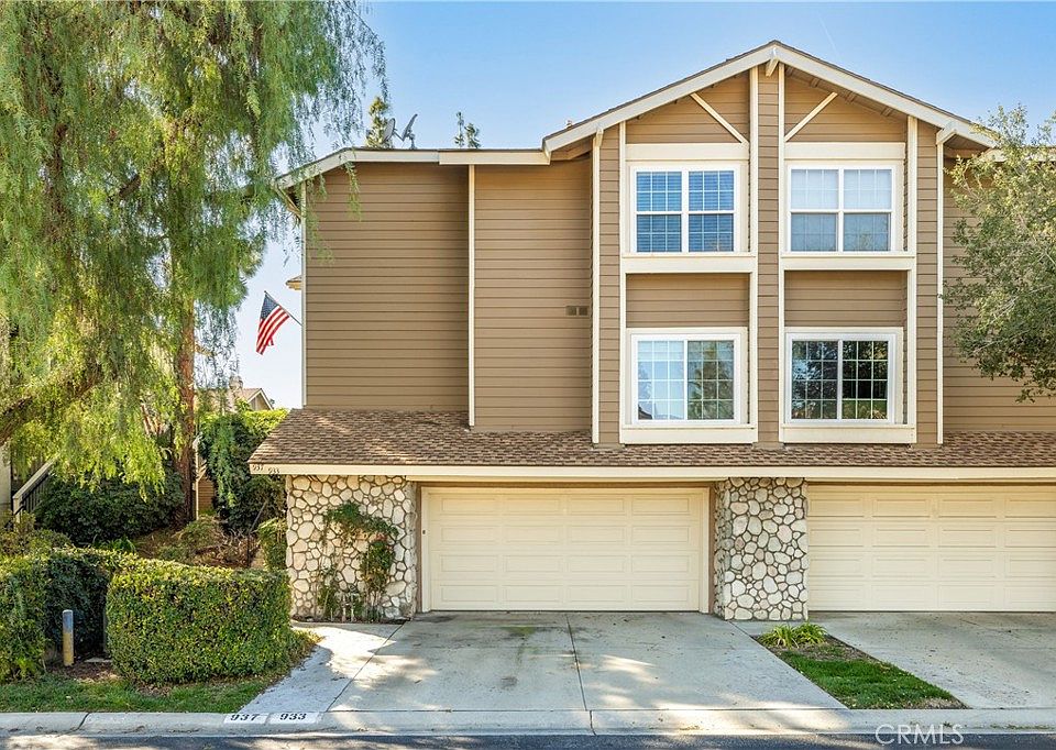 SINGLE LEVEL CONDO | TWO MASTER SUITES | THE VILLAGE AT SAN DIMAS. Situated on the second level, this single story condo offers the perfect open floor plan. The front door opens to laminate wood flooring and to a spanning family room and kitchen. The kitchen features painted cabinetry, clean white tiled countertops, stainless steel appliances, countertop seating, and a garden window with a nice view. An eating area sits under a light fixture and is also open to the family room which offers laminate wood flooring, a brick fireplace, and a sliding door to the back patio and backyard. The hallway offers a half bathroom and a closet with a washer and dryer. The main master bedroom features carpeted flooring, mirrored closet doors, and an ensuite bathroom. The master bathroom offers a sink with spacious countertops and a travertine tiled shower/tub with a sliding glass enclosure. The second master bedroom also offers carpeted flooring, a sliding door to the back patio, and an ensuite bathroom. The second master bathroom offers a single sink with extra countertops space and a shower/tub with a sliding glass enclosure. The backyard offers a covered patio, steps that lead down to a cozy concrete open air patio, and a fenced artificial turf lawn surrounded by planters. There is a detached two car garage just across the street from the unit. The Village also offers two swimming pools, a clubhouse, and a playground area.