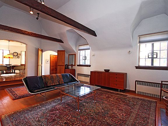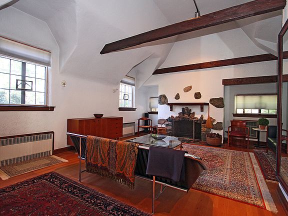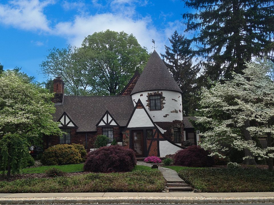 One-of-a-kind, enchanting Tudor in South Mountain Estates, just steps from Taylor Park, Millburn High School and Downtown Millburn shopping and Midtown Manhattan train. Filled with dramatic architectural details, including a turret on 2 floors that makes the formal dining room and the bedroom above, completely round. Owned by the same family for 50 years, this unique home has the touches of a professional designer with custom closets, doors, window storms & screens and many built-ins. There are 4 Bedrooms and 2 baths upstairs and the first level has a den with a separate entrance and a full bath, so it could be used as a guest bedroom. There is a large 2 car garage that enters into a spacious European eat-in kitchen, which also has a back door to a very private deck that wraps around the back, side and front of the house. The sun room off the kitchen has a vaulted ceiling, walls of windows and doors to the wrap around deck. Extremely private property with tall perimeter bushes and trees, there is also a bamboo fence that enclosed the deck. Beautiful landscaping and flowering trees surround this lovely home and create a perfect retreat so close to town. Never a drop of water has landed in the finished basement after all storms and floods, this home remains bone dry. The finished basement has a recreation room with built-in desks, a work shop, laundry, storage and utility room. The entire house has built-in fans and lots of track & specialty spot lighting.
