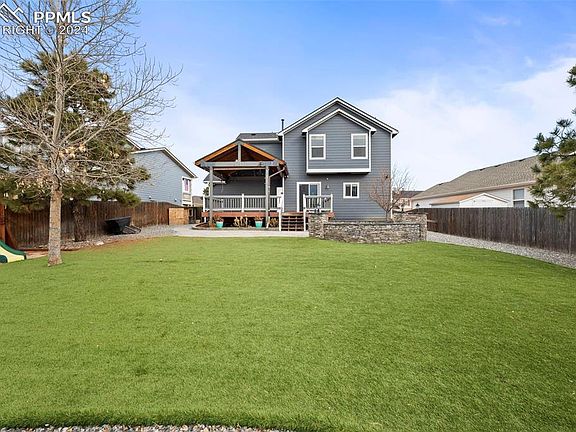 This lovely, spacious Woodmen Hill home awaits you. Great curb appeal, only steps away from the community center & recreation facility. Newer furnace, roof, new landscaping and auto sprinklers. This is a 4+4+2 car garage, with over 2400 sq ft, finshed basement, large kitchen area with pantry, ample cabintry & solid countertops. Slider door in kitchen transports plenty of light and walks out to outdoor rear patio, overlooking level yard with much room for additional landscape features. Fireplace/insert is in living room on main floor along with garage entry, laundry area and kitchen. Stove, dishwasher, refrigerator, microwave, washer and dryer all stay. Also includes window treatments, fans, large driveway. Close to newer retail stores, auto service businesses and fine restaurants. Hiking, running & bike trails, scattered parks throughout Falcon, Antler Creek Golf Course, D-49 schools-all contributing to a slower paced, tight knit and growing community. Please schedule your appointment and check out the great value.