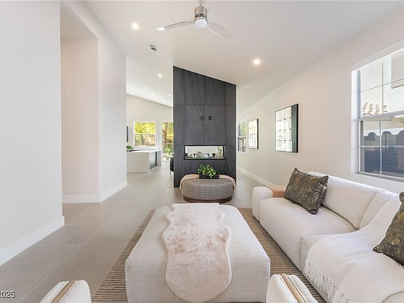 Modern Luxury Meets Timeless Charm. Redesigned with today’s lifestyle in mind, this stunning single-story home in Peccole Ranch offers 4 bedrooms, 3 baths, and a spacious 3-car garage. Interior design features boasts large format tile flooring, 5-inch baseboards, custom paint, modern lighting, and window shades throughout. The custom dual-facing stone fireplace compliments the open floorplan and vaulted ceilings adding warmth and sophistication to both the living and dining areas. The modern Euro-style kitchen features a quartz waterfall island, custom cabinetry, and stainless-steel appliances. The spacious owner’s suite offers a spa-like bath with oversized shower and soaking tub. The thoughtfully manicured front yard has great curb appeal, while the meticulously landscaped backyard opens to a scenic greenbelt with no direct rear neighbors. Peccole Ranch offers many amenities and is minutes from Downtown Summerlin, Red Rock, and the Strip. Welcome Home.