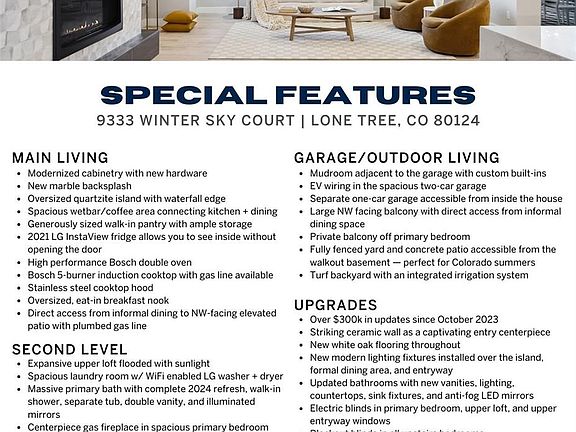 Thoughtfully redesigned, this exceptional home offers modern luxury with custom finishes, just minutes from premier dining, shopping, and recreation. Every detail has been meticulously curated, from the fresh white oak flooring to the modernized cabinetry with new hardware. The heart of the home features a bright and open living area and stunning kitchen with new marble backsplash, an oversized quartzite island with a waterfall edge, and stainless steel appliances, including a 5-burner induction cooktop with gas line available, and double wall ovens. A spacious bar and coffee area seamlessly connects the kitchen to the dining space, complemented by a generously sized walk-in pantry. The open, bright walkout basement features new carpet, a lower-level micro kitchen, and an expansive rec area ideal for a game room or home theater. Also downstairs is an additional flex space, a full-size bedroom, detached bathroom, and a spacious office with French doors. Upstairs, you will find the oversized, sun-filled loft and two secondary bedrooms both with a fully updated 3/4 ensuite bath. The primary suite is a retreat of its own, featuring a centerpiece gas fireplace, electric blackout blinds, an oversized walk-in closet with custom shelving, and a luxurious five-piece bath with a walk-in shower, separate tub, and double vanities with illuminated anti-fog mirrors. Enjoy both mountain and city views from the primary bedroom balcony or the expansive Northwest-facing balcony off the kitchen, complete with a plumbed gas grill. With over $300k in thoughtful updates, including new modern lighting fixtures, a custom ceramic tile wall upon entry, updated bathrooms, and a brand-new hail-resistant roof, no detail has been spared. Situated just across from Lone Tree Rec Center and Prairie Sky Park, and with walking trails just outside your front door, this home offers turnkey Colorado living with both city and outdoor entertainment at your fingertips.