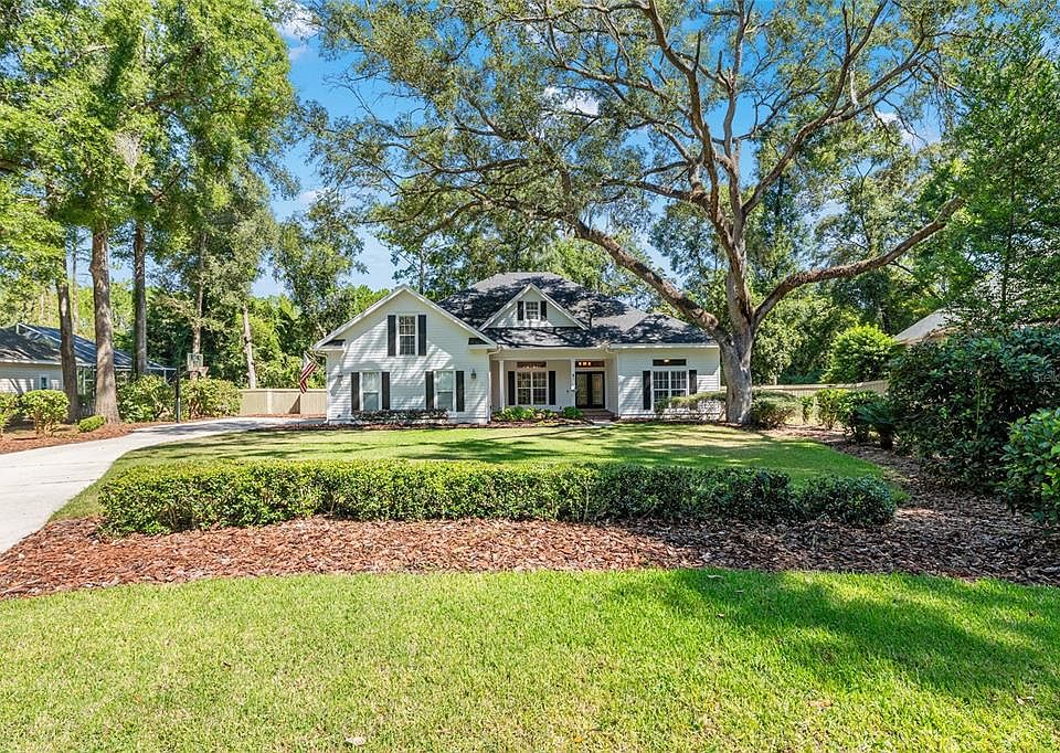 Welcome to this beautifully maintained home located in the sought-after Mills Glen neighborhood of Haile Plantation. Built by renowned builder Paul McArthur, this thoughtfully designed 3-way split floor plan offers approximately 3,010 square feet of living space, featuring 5 bedrooms and 4 full bathrooms. Step inside to an inviting open layout that includes a spacious living room, formal dining room, and a well-appointed kitchen with granite countertops, ample cabinetry, and a sunny eat-in breakfast area. The great room impresses with abundant natural light, French doors, wood flooring, custom built-ins, a cozy fireplace, high ceilings, and elegant crown molding along with other incredible millwork. The intelligently designed layout includes two bedrooms sharing a full bath, along with a private guest suite featuring its own en-suite bathroom ideal for visitors or extended family with the fifth en-suite versatile bedroom tucked away upstairs making it a great bonus room or home office. The expansive primary suite is a true retreat, complete with tray ceilings, a sitting area, large windows, a generous walk-in closet, and a luxurious bathroom offering a jetted tub, walk-in shower, dual vanities, and direct access to a private screened porch. Additional features include a well-equipped laundry room with extra storage and a utility sink, plus a two-car garage with a large storage closet. Enjoy outdoor living on the spacious screened lanai overlooking a secluded, fenced backyard including a gorgeous, newly installed paver patio area backing up to a private common area. Residents love the walkable lifestyle with easy access to Haile Village Center’s restaurants, shops, and the popular Saturday farmers market. Haile Plantation is a vibrant golf course community offering parks, playgrounds, pools, tennis courts, paddle ball courts, and miles of walking trails. Conveniently located near Celebration Pointe, UF/Shands, VA, top-rated schools, dining, and more.