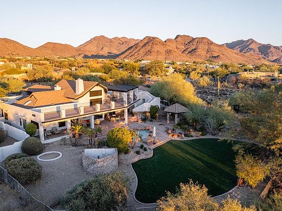 Postcard worthy panoramic views in the heart of North Scottsdale, picture perfectly situated on an acre lot backing to natural desert open space. Charming arrival with circle drive and courtyard entry, this remodeled modern estate is desirably designed with split bedroom layout with oversized secondary bedroom that could serve as a second primary suite, plus a separate guest house on property. Chic 24''x48'' hand laid 'concrete look' tile flooring and current lighting, sets the stage for this transitional contemporary, with soaring beamed living entry that overlooks the expansive resort style backyard and Sonoran backdrop. Gourmet eat-in kitchen with Thermador oversized gas cooktop, built-in wall oven/microwave, and wine fridge, designer Monte Blanc onyx and Labordorite countertops and sleek cabinets. Generous 500 detached private entry guest house with living, kitchen, bedroom, bath and large closet with private patio and access to back yard amenities. Spa like owner's suite with sitting area, fireplace, steam shower and jacuzzi bath. Serene south facing outdoor living for reserved living with expansive viewing deck with sweeping 360-degree views of multiple mountain ranges and stunning city lights, full length covered patio, heated pool with waterfall, ramada with built in BBQ, abundant artificial turfed area for large parties or play. Feel removed from the city yet conveniently minutes from the 101 hwy, shopping, restaurants, hiking, golf and more. Arizona Sonoran living at its finest.