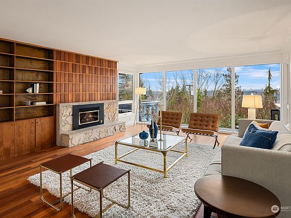 You'll love the views, light, and privacy in this 6 BR, 3.25 BA mid-century gem on a private lane off Mercerwood Drive! Take in the Cascades & partial lake view from the family room, formal dining, kitchen, huge main deck, or the hot tub on the private deck off the primary bedroom. Mid-century mod features include floor-to-ceiling windows, hardwood built-ins & 2 fireplaces. Excellent floor plan with 3 BR & 2.25 BA on main. Downstairs find 3 BR, 1 BA, enormous rec room plus workshop & storage room. Fully-fenced backyard with patio, flat lawn and play structure. Pre-inspected with new paint, plush carpet, fence and new AC & furnace (all in 2022), H2O heater (2018). Excellent north-end location just mins from I-90, downtown & MI schools!